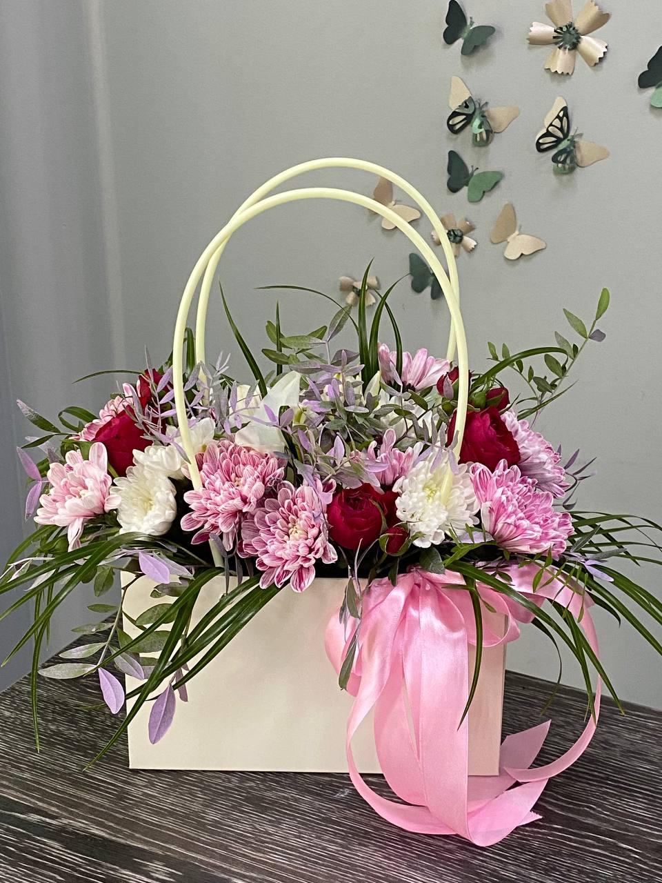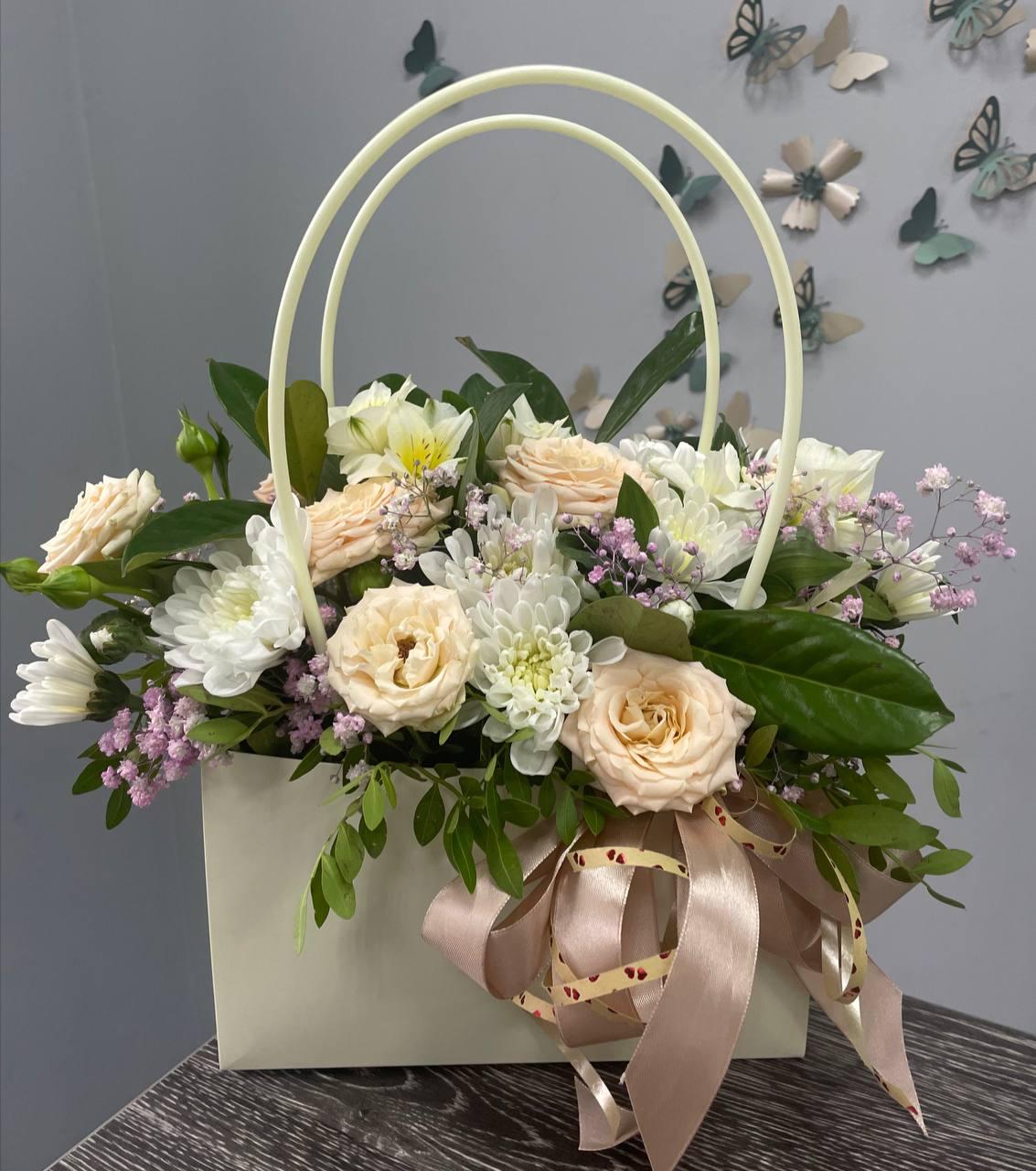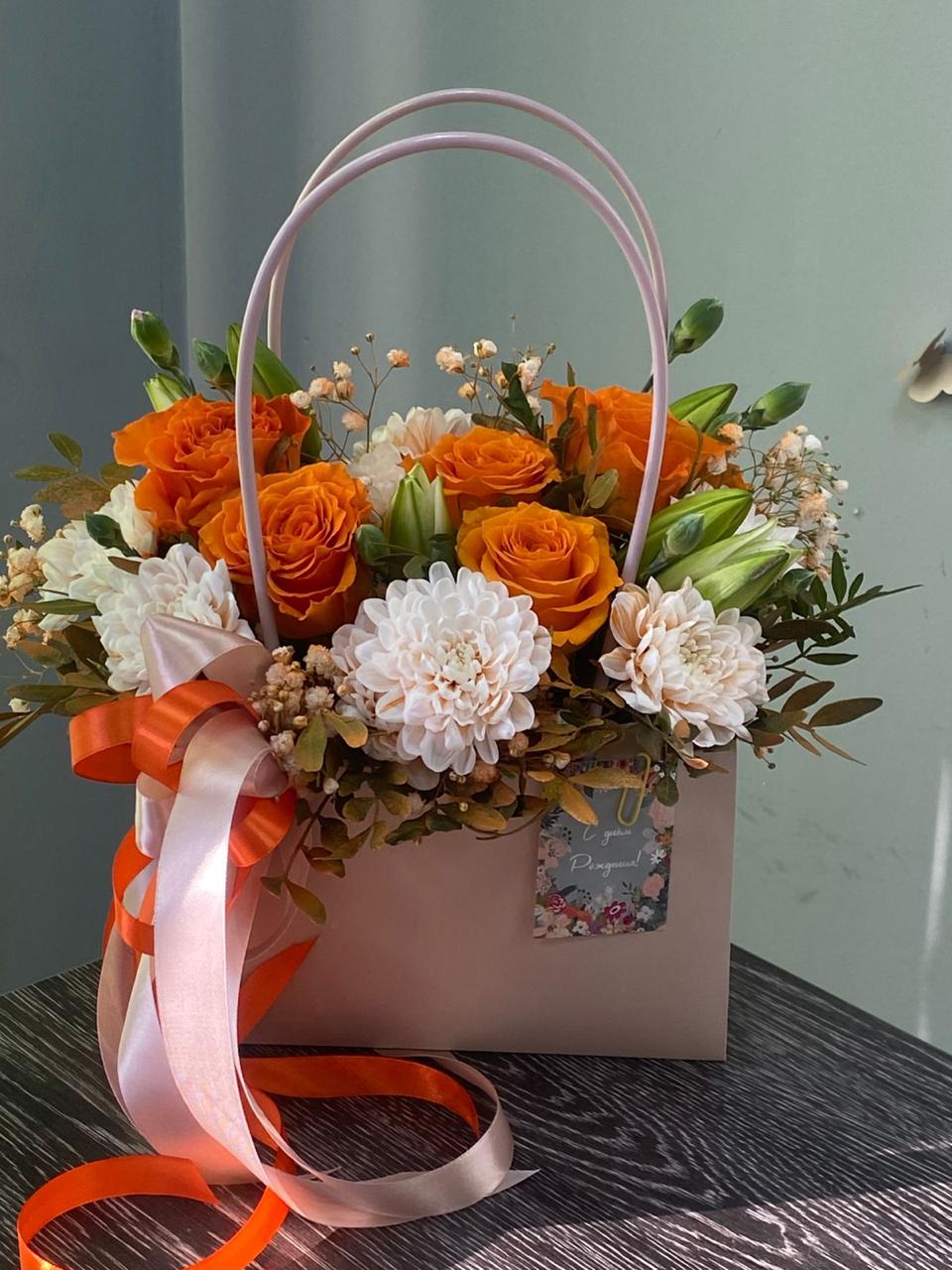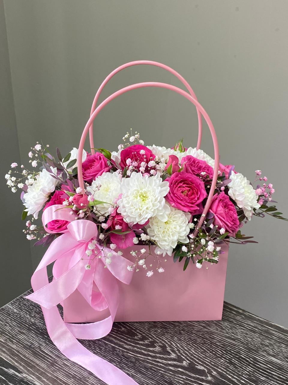 Цветочные композиции в сумочках или коробках станут отличным
