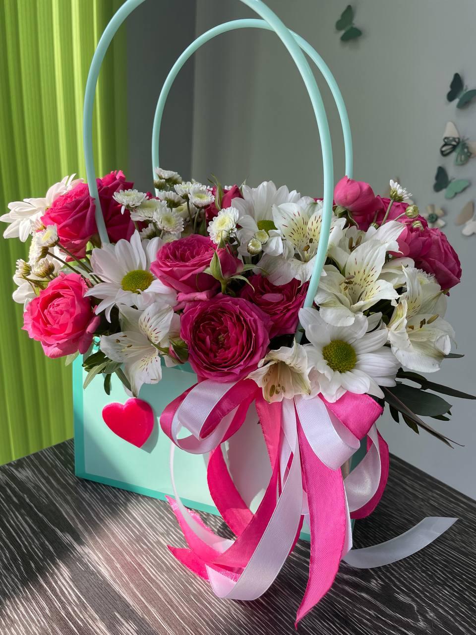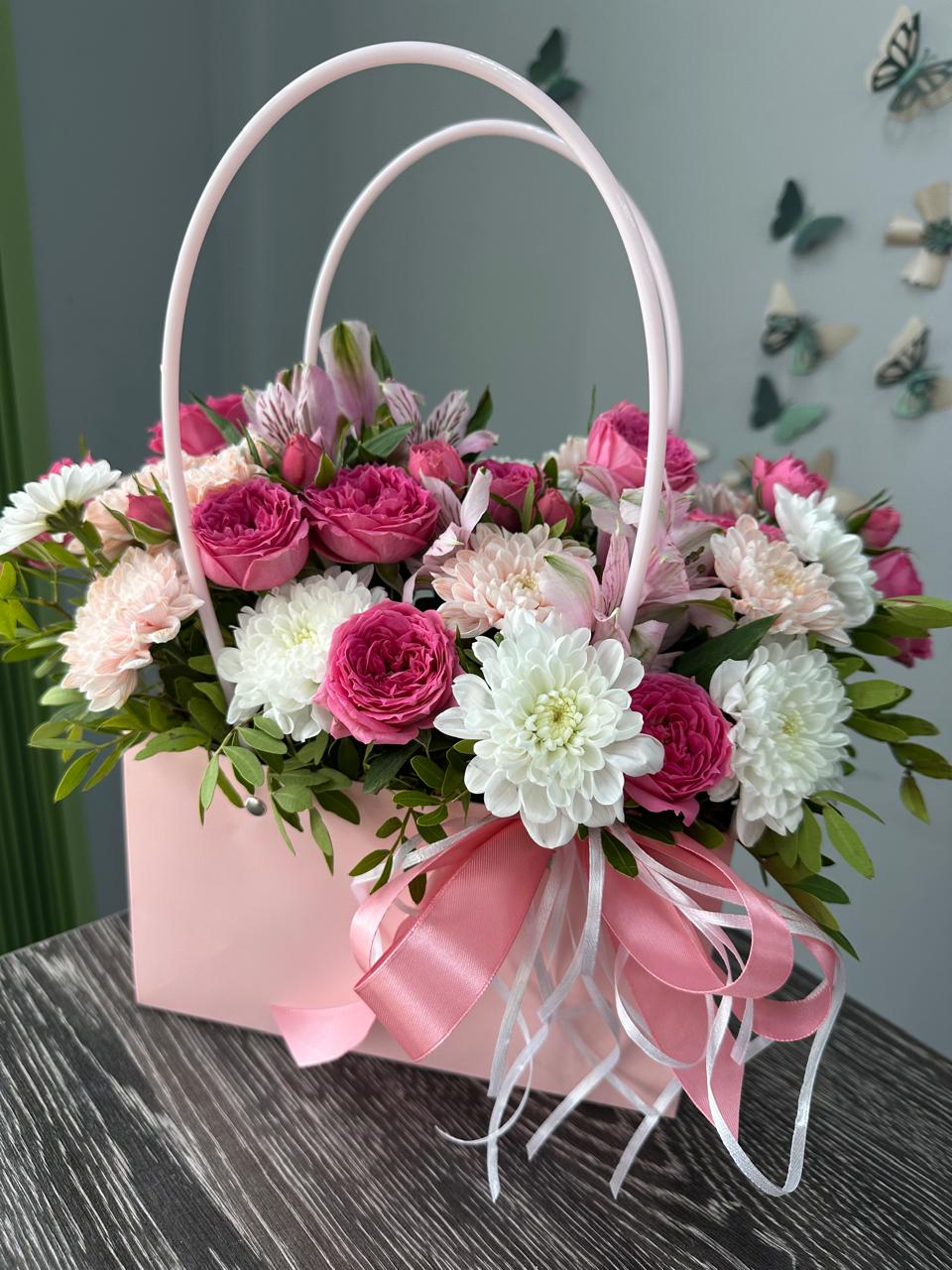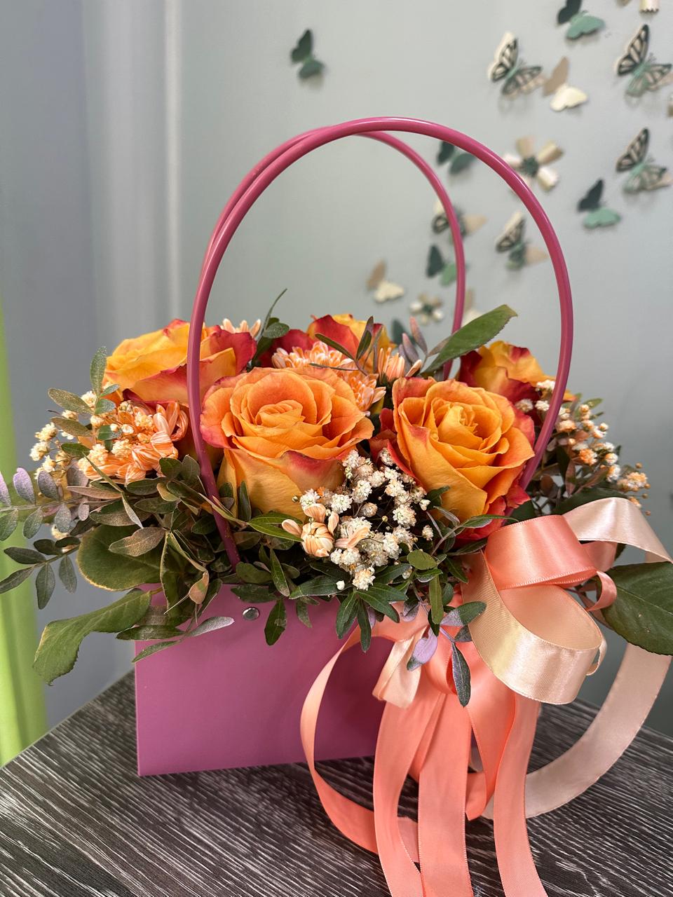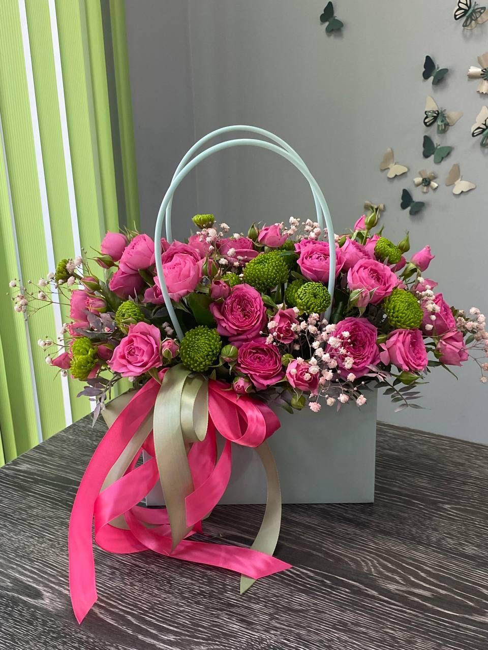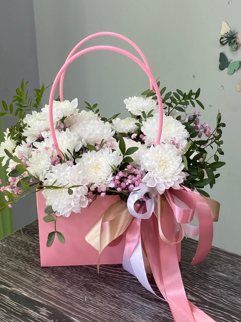 Цветочные композиции в сумочках или коробках станут отличным