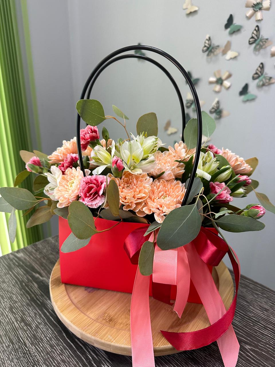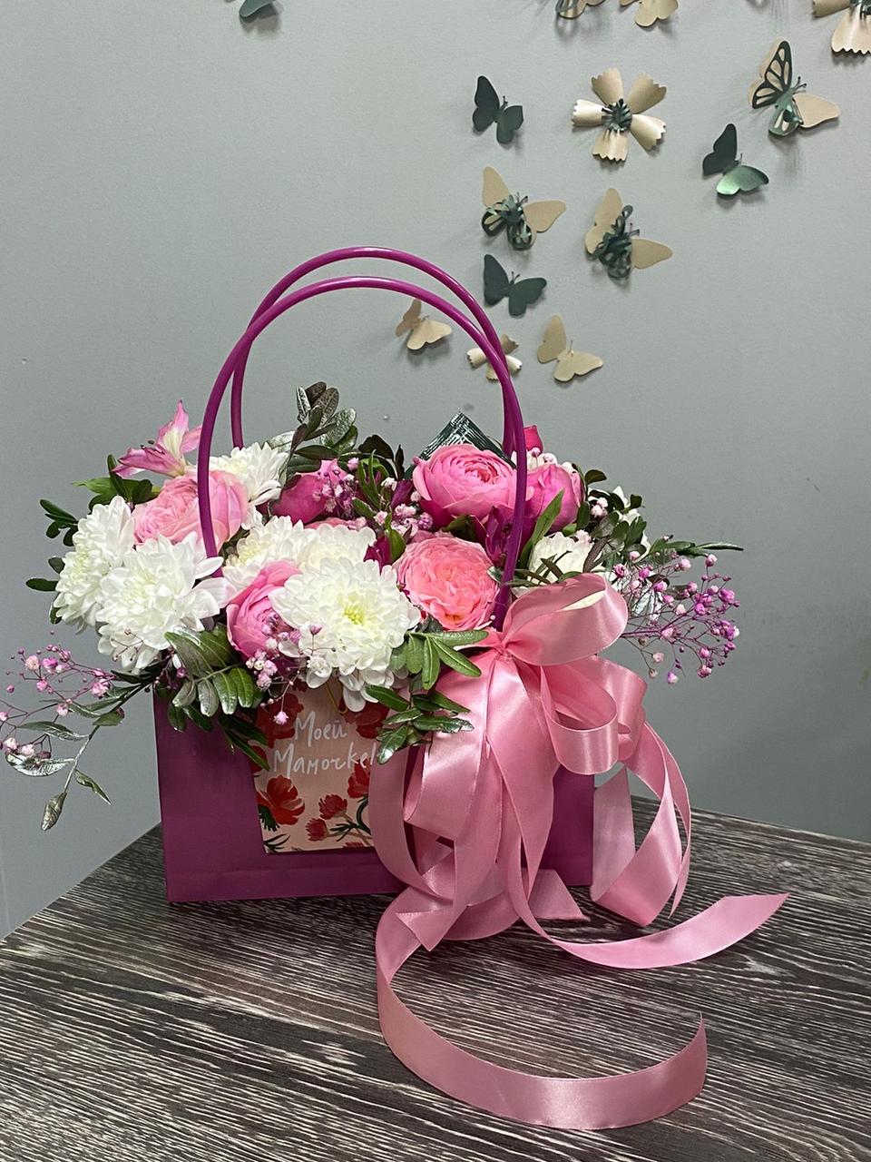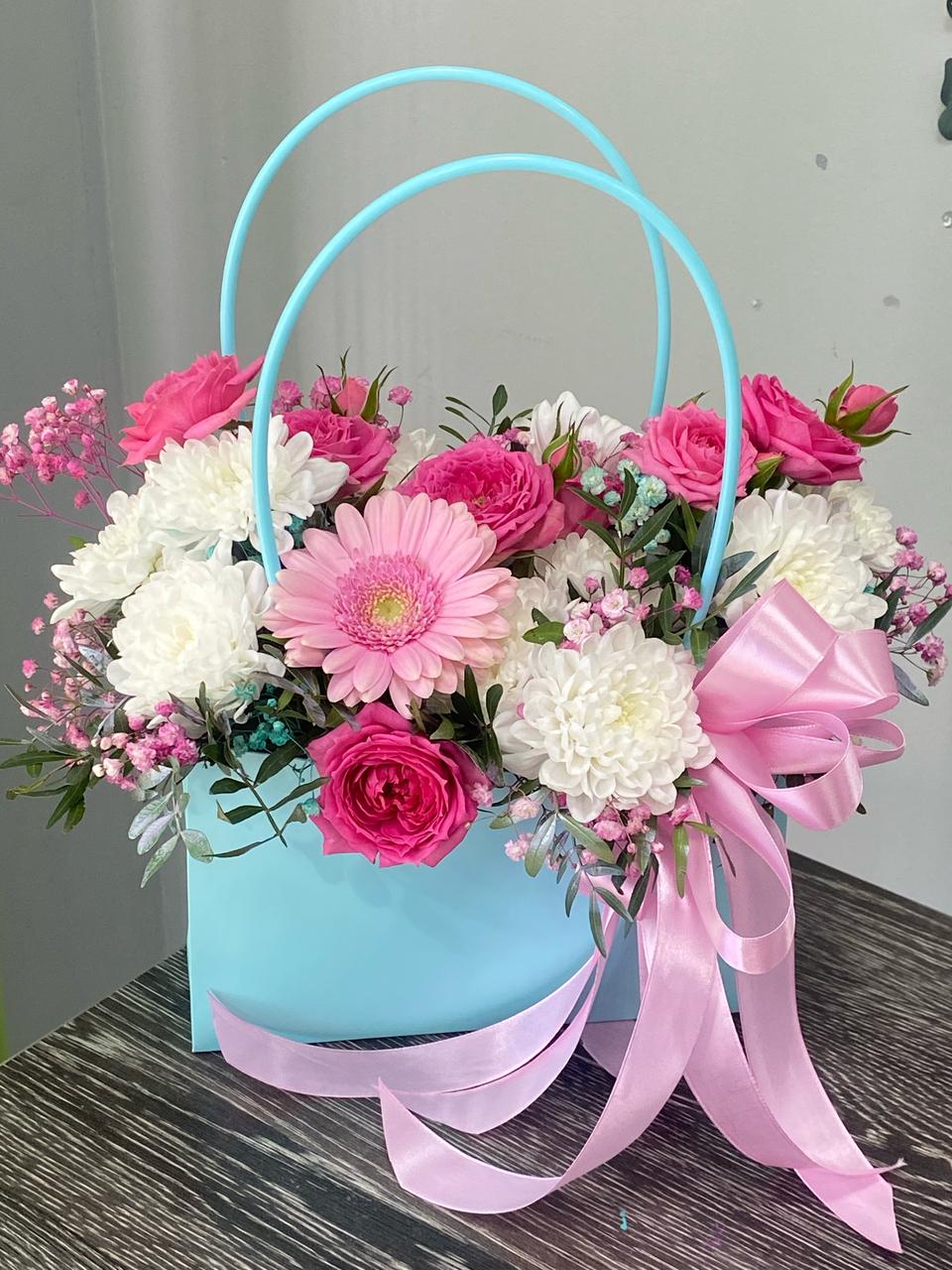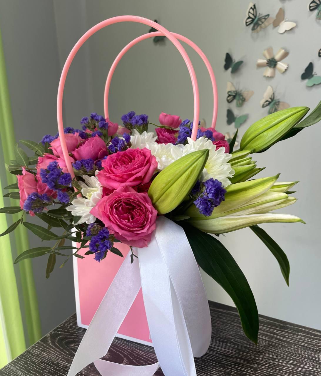 Цветочные композиции в сумочках или коробках станут отличным