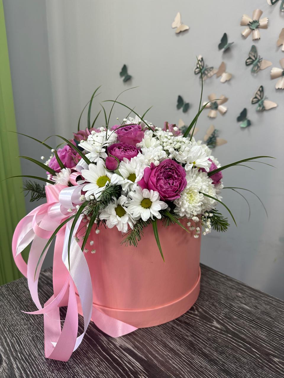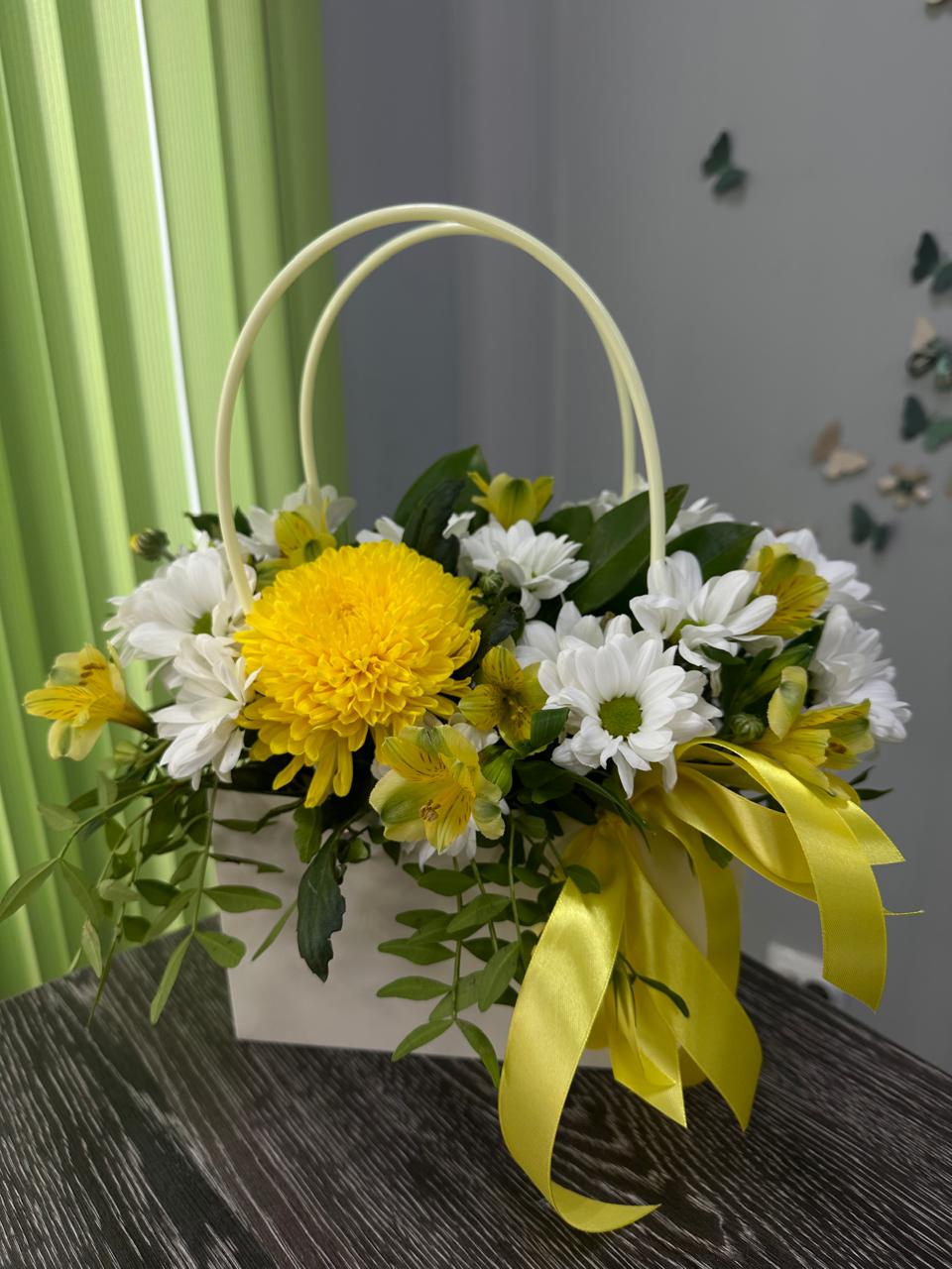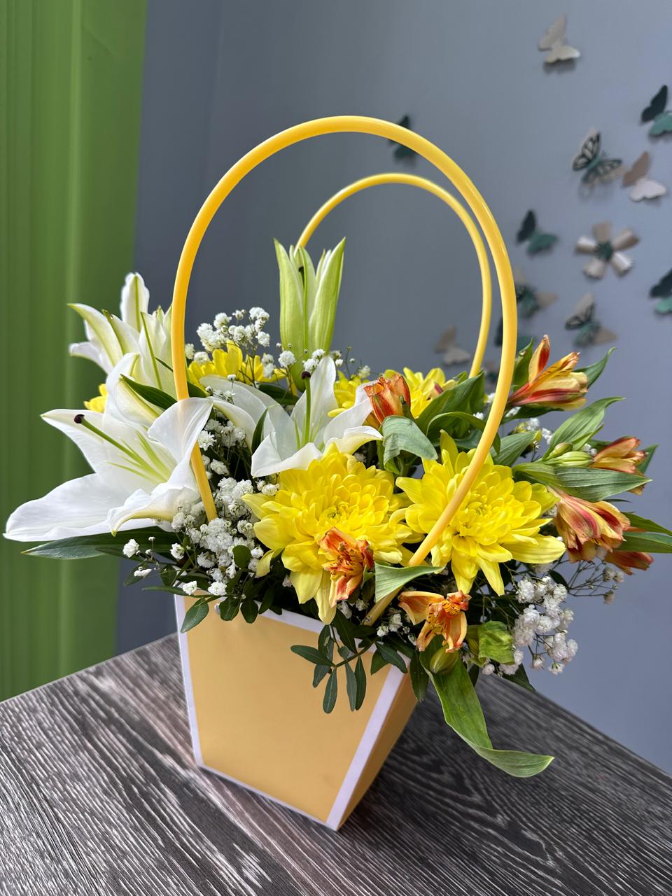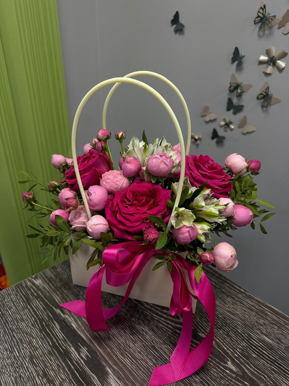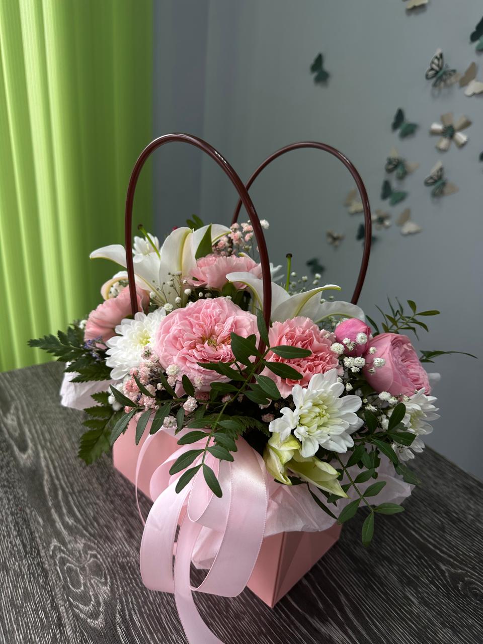 Цветочные композиции в сумочках или коробках станут отличным